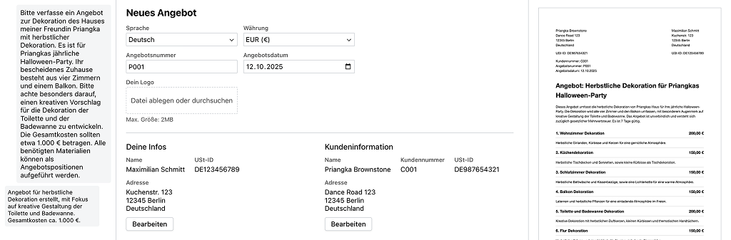 Der KI-gestützte Online-Angebotsgenerator erstellt aus deinen Anweisungen in Sekunden ein überzeugendes Angebot, das du einfach als PDF herunterladen kannst.