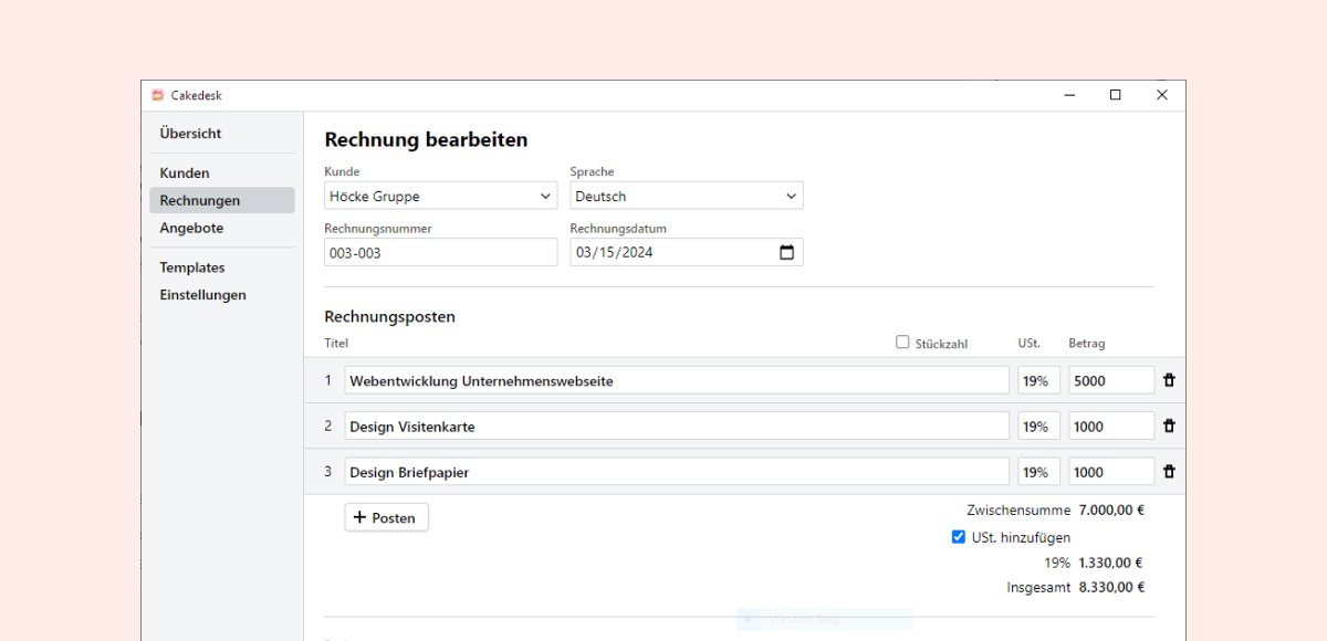 Cakedesk: Ein einfaches Rechnungsprogramm für Windows