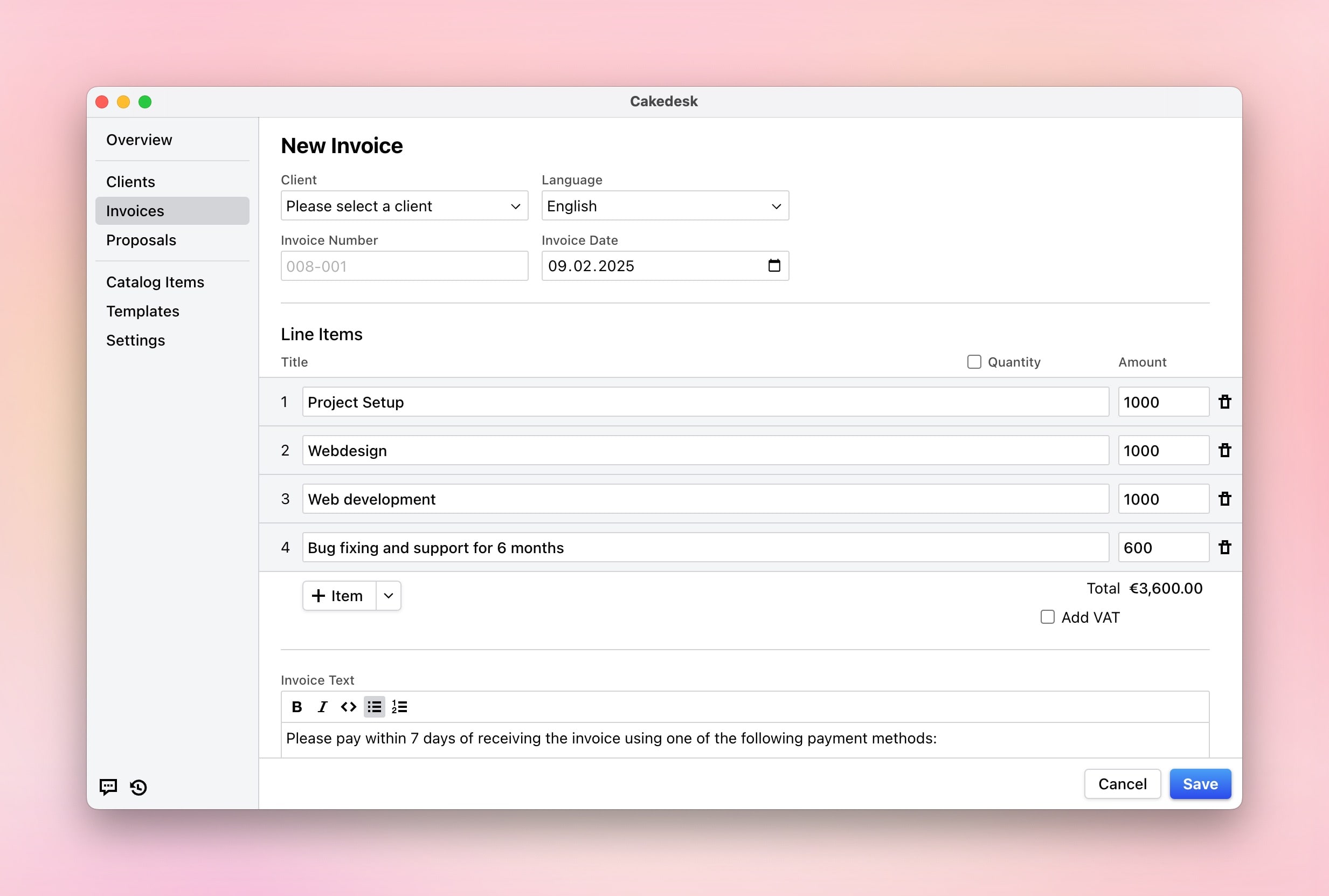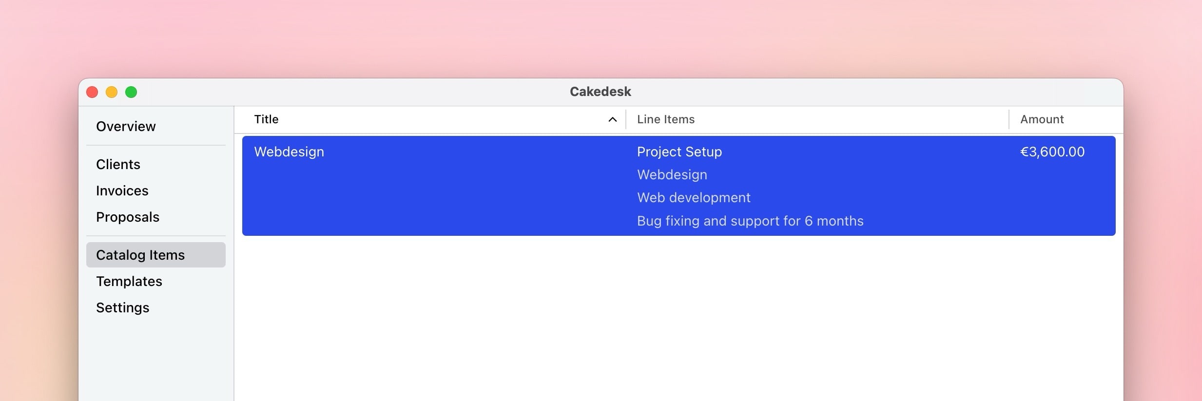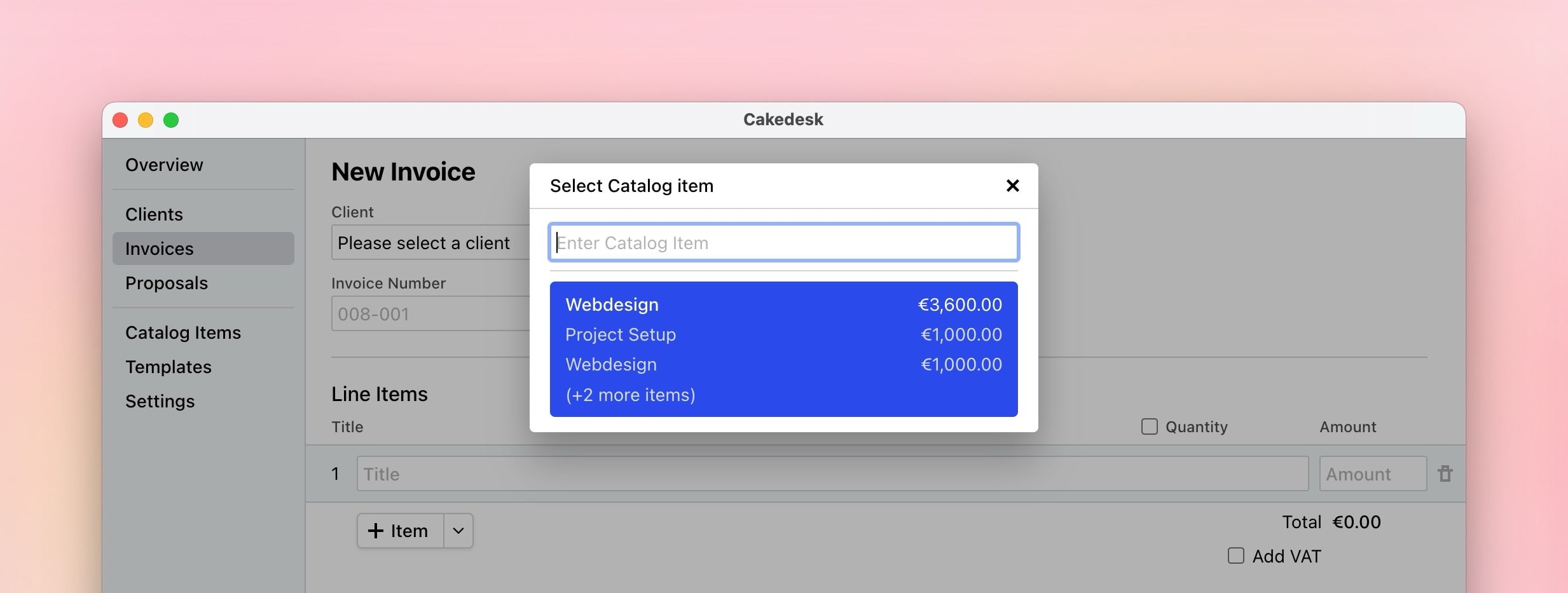 In Cakedesk, you can create reusable catalog items to quickly add products or services to your invoices and proposals.