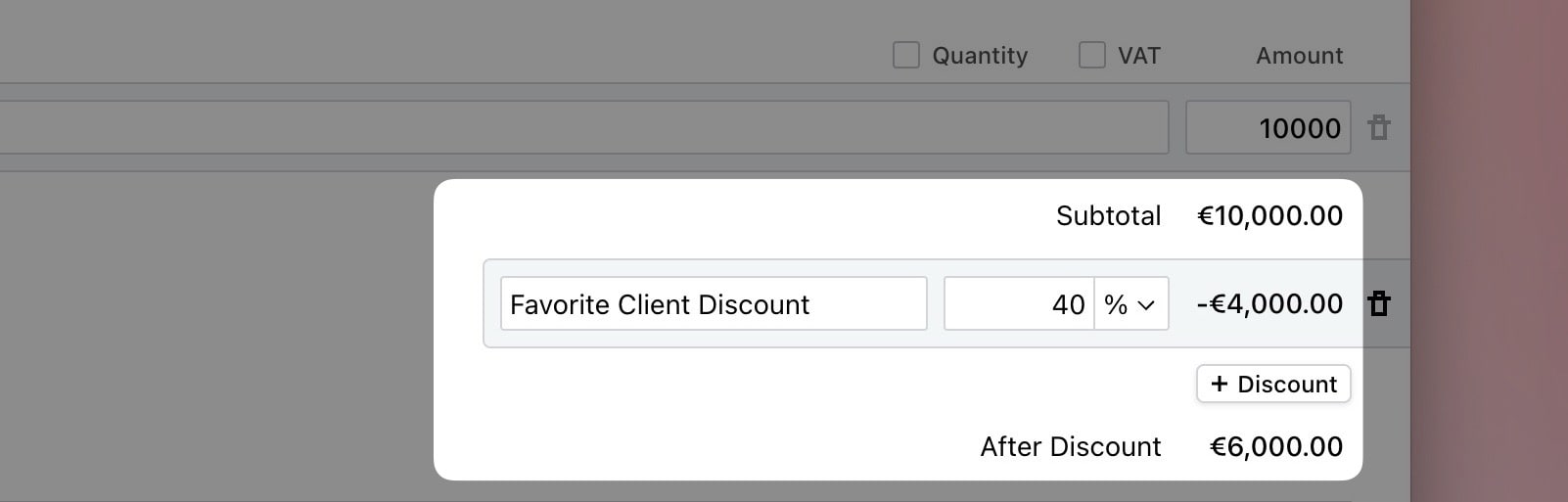 In Cakedesk, you can add discounts to invoices and proposals. Discounts can be added as a percentage or a fixed amount and are applied to the total amount of the invoice or proposal.