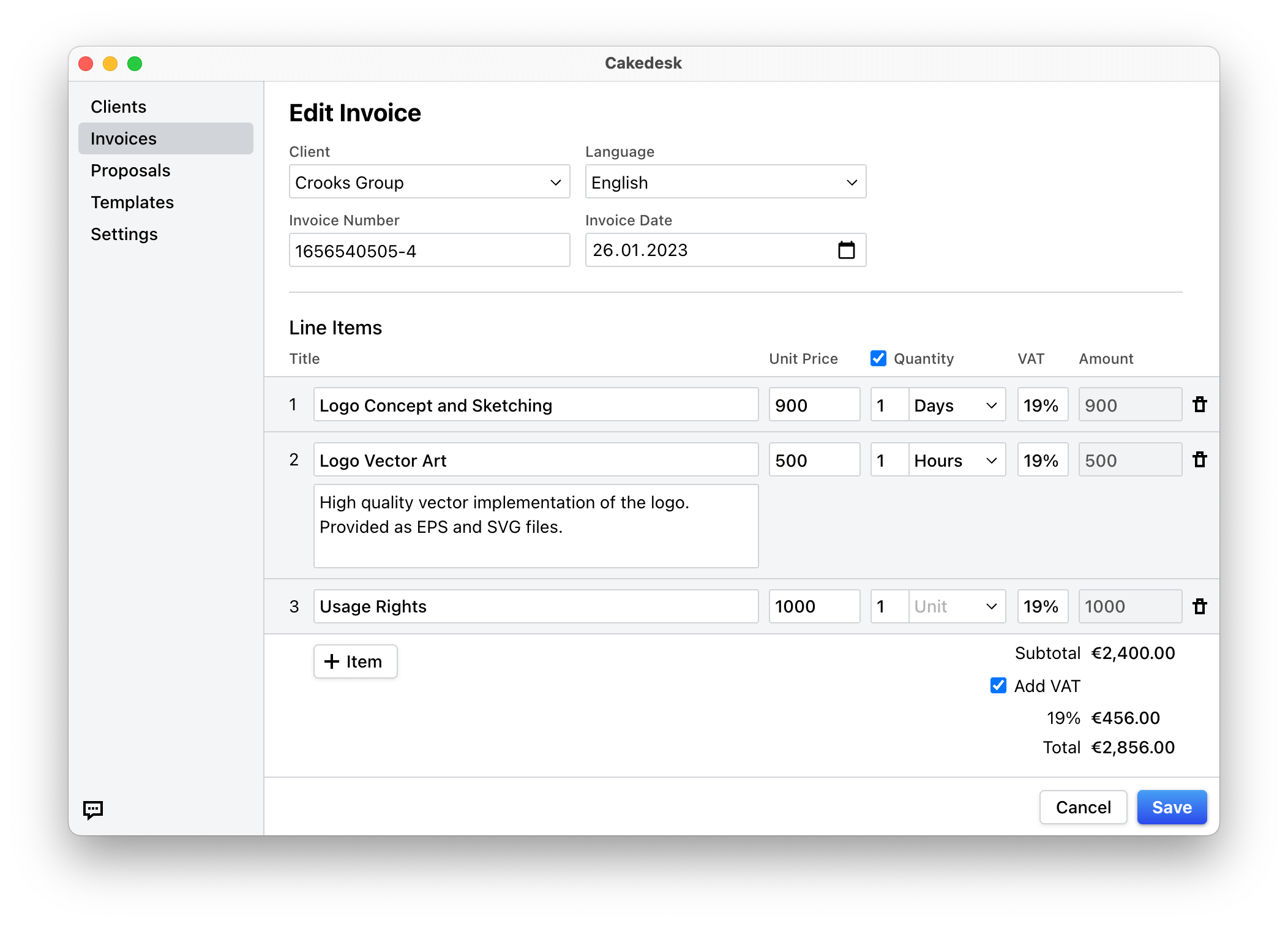 Create highly detailed proposals and invoices using nested items and rich text descriptions